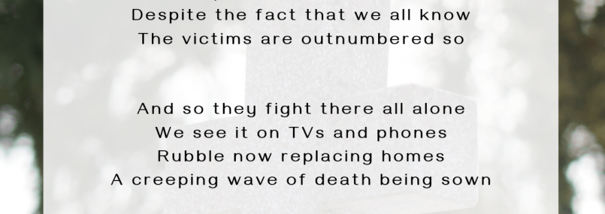 It's everywhere this week, from TVs to phones, newspapers to radio, our world is at war and so with saddened heart I write these words today... I hope humanity can rise to the humanitarian challenge it is now facing, that aggressor's everywhere are defeated, and that ultimately, goodness, freedom, love and peace win, and with… Continue reading ‘O World at War’, by Pauline O’Shea