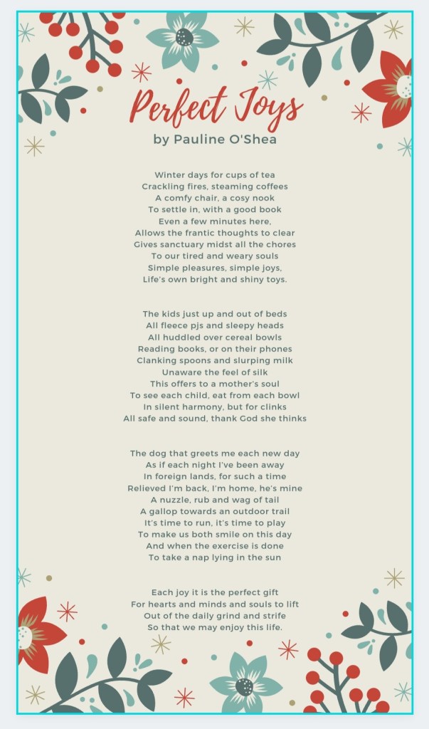 I will leave you with a poem I wrote, called ‘Perfect Joys’… which captures some of the simple, yet precious joys of daily life. I am sure these things will resonate with many of you. Hope you enjoy!